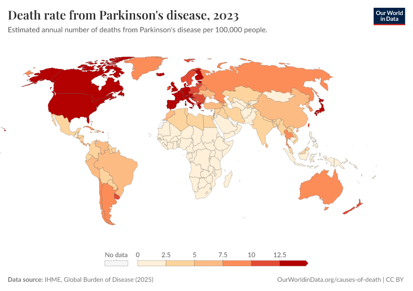 “Data Page: Death rate from Parkinson's disease”, part of the following publication: Esteban Ortiz-Ospina and Max Roser (2016) - “Global Health”. Data adapted from IHME, Global Burden of Disease. Retrieved from https://select-date-by-typing.owid.pages.dev/grapher/death-rate-from-parkinsons-disease-gbd [online resource]How to cite this data