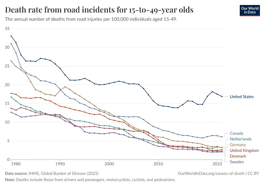 IHME, Global Burden of Disease (2024) – with minor processing by Our World in Data. “Death rate from road incidents for 15-to-49-year olds” [dataset]. IHME, Global Burden of Disease, “Global Burden of Disease - Deaths and DALYs” [original data]. Retrieved January 6, 2026 from https://select-date-by-typing.owid.pages.dev/grapher/death-rate-from-road-accidents-for-15--to-49-year-olds