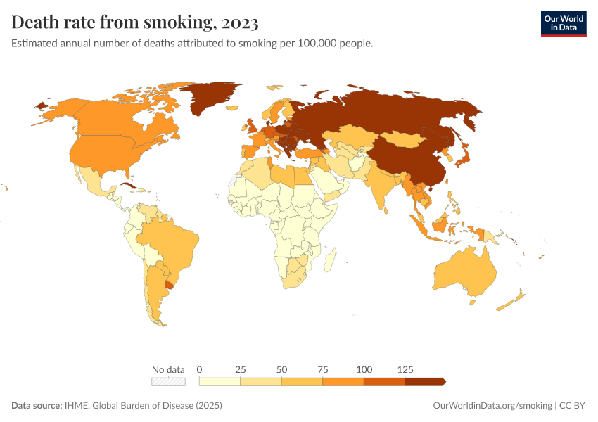 IHME, Global Burden of Disease (2024) – with minor processing by Our World in Data. “Death rate from smoking” [dataset]. IHME, Global Burden of Disease, “Global Burden of Disease - Risk Factors” [original data]. Retrieved January 6, 2026 from https://select-date-by-typing.owid.pages.dev/grapher/death-rate-from-smoking