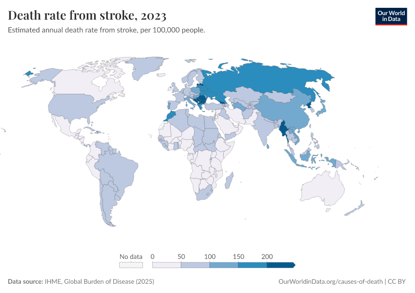 IHME, Global Burden of Disease (2024) – with minor processing by Our World in Data. “Death rate from stroke” [dataset]. IHME, Global Burden of Disease, “Global Burden of Disease - Deaths and DALYs” [original data]. Retrieved January 6, 2026 from https://select-date-by-typing.owid.pages.dev/grapher/death-rate-from-strokes
