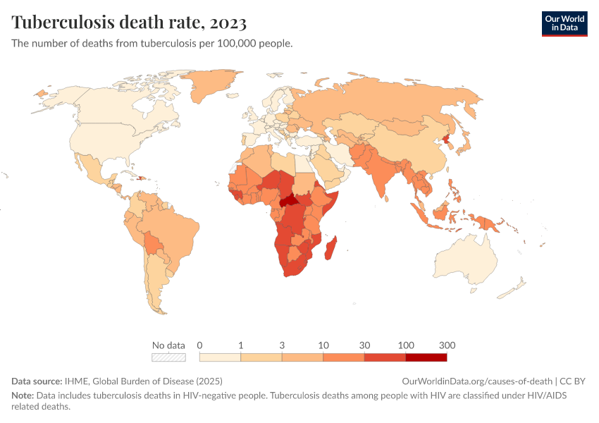 IHME, Global Burden of Disease (2024) – with minor processing by Our World in Data. “Tuberculosis death rate” [dataset]. IHME, Global Burden of Disease, “Global Burden of Disease - Deaths and DALYs” [original data]. Retrieved January 6, 2026 from https://select-date-by-typing.owid.pages.dev/grapher/death-rate-from-tuberculosis-gbd