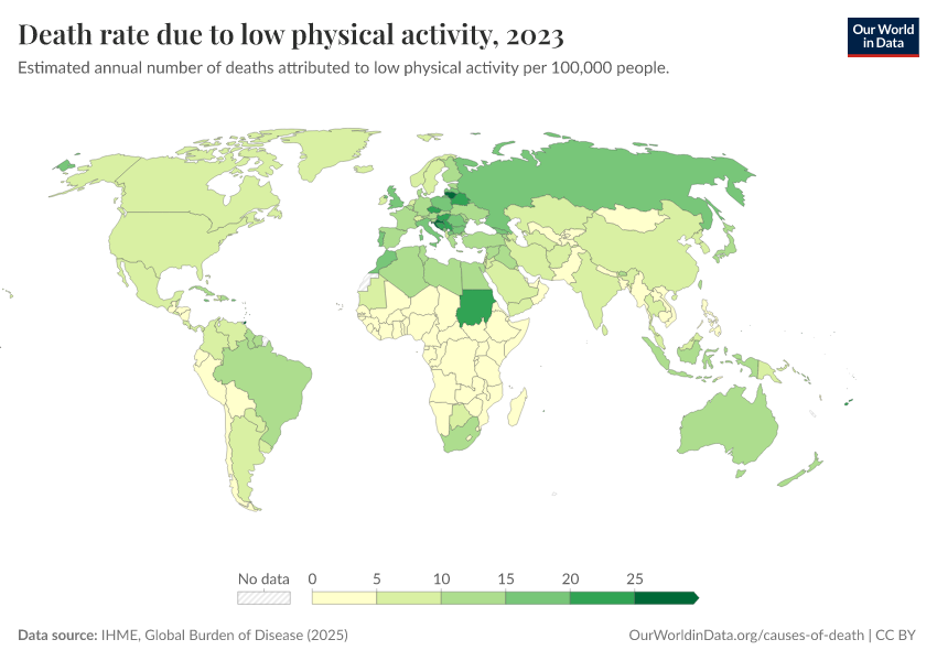 IHME, Global Burden of Disease (2024) – with minor processing by Our World in Data. “Death rate due to low physical activity” [dataset]. IHME, Global Burden of Disease, “Global Burden of Disease - Risk Factors” [original data]. Retrieved January 6, 2026 from https://select-date-by-typing.owid.pages.dev/grapher/death-rates-due-to-low-physical-activity-gbd