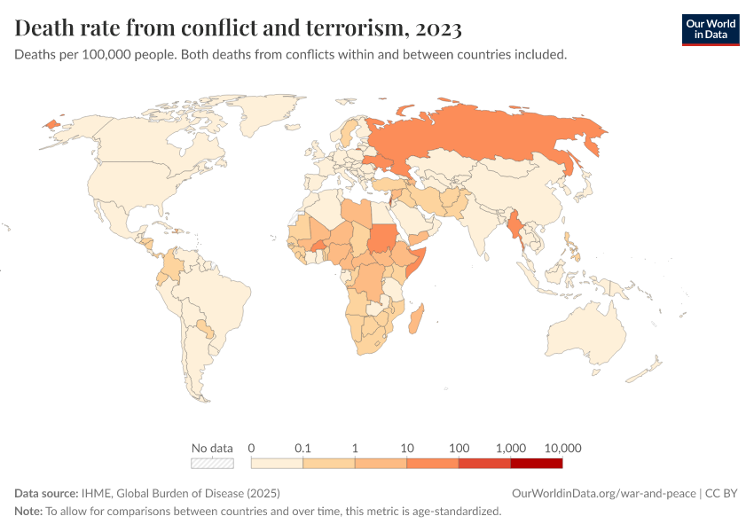 IHME, Global Burden of Disease (2024) – with minor processing by Our World in Data. “Death rate from conflict and terrorism” [dataset]. IHME, Global Burden of Disease, “Global Burden of Disease - Deaths and DALYs” [original data]. Retrieved January 6, 2026 from https://select-date-by-typing.owid.pages.dev/grapher/death-rates-from-conflict-and-terrorism-gbd