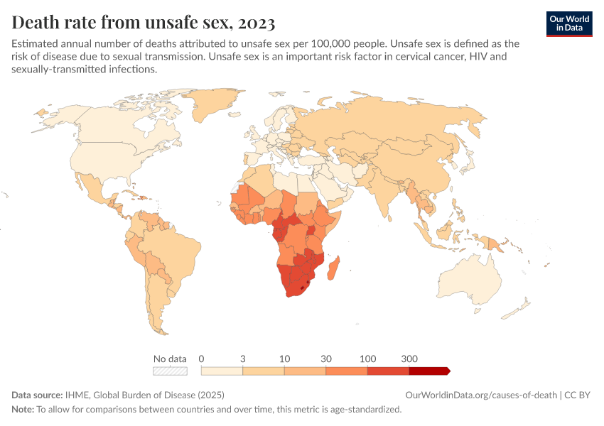 IHME, Global Burden of Disease (2024) – with minor processing by Our World in Data. “Death rate from unsafe sex” [dataset]. IHME, Global Burden of Disease, “Global Burden of Disease - Risk Factors” [original data]. Retrieved January 6, 2026 from https://select-date-by-typing.owid.pages.dev/grapher/death-rates-from-unsafe-sex