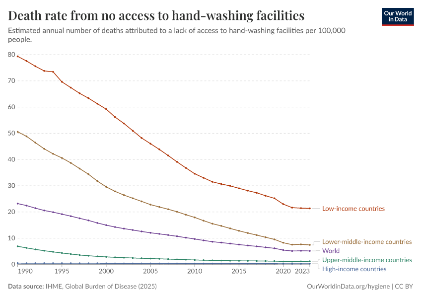 IHME, Global Burden of Disease (2024) – with minor processing by Our World in Data. “Death rate from no access to hand-washing facilities” [dataset]. IHME, Global Burden of Disease, “Global Burden of Disease - Risk Factors” [original data]. Retrieved January 6, 2026 from https://select-date-by-typing.owid.pages.dev/grapher/death-rates-no-handwashing