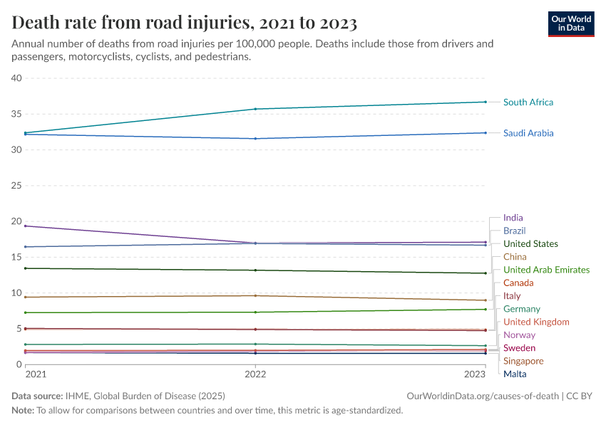 IHME, Global Burden of Disease (2024) – with minor processing by Our World in Data. “Death rate from road injuries” [dataset]. IHME, Global Burden of Disease, “Global Burden of Disease - Deaths and DALYs” [original data]. Retrieved January 6, 2026 from https://select-date-by-typing.owid.pages.dev/grapher/death-rates-road-incidents