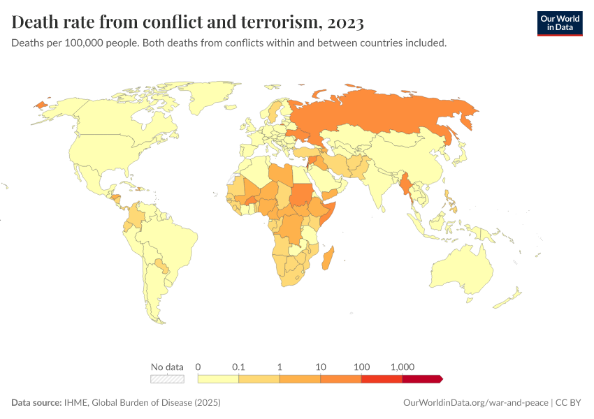 “Data Page: Death rate from conflict and terrorism”, part of the following publication: Esteban Ortiz-Ospina and Max Roser (2016) - “Global Health”. Data adapted from IHME, Global Burden of Disease. Retrieved from https://select-date-by-typing.owid.pages.dev/grapher/deaths-conflict-terrorism-per-100000 [online resource]How to cite this data