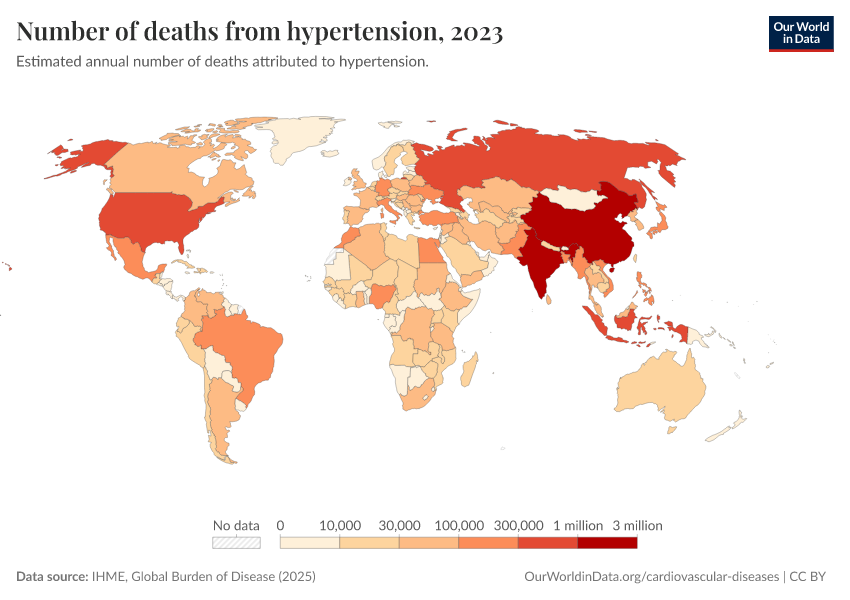 IHME, Global Burden of Disease (2024) – with minor processing by Our World in Data. “Number of deaths from hypertension” [dataset]. IHME, Global Burden of Disease, “Global Burden of Disease - Risk Factors” [original data]. Retrieved January 6, 2026 from https://select-date-by-typing.owid.pages.dev/grapher/deaths-due-to-high-blood-pressure
