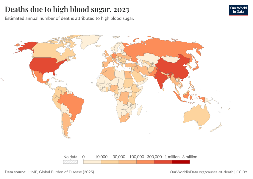 IHME, Global Burden of Disease (2024) – with minor processing by Our World in Data. “Deaths due to high blood sugar” [dataset]. IHME, Global Burden of Disease, “Global Burden of Disease - Risk Factors” [original data]. Retrieved January 6, 2026 from https://select-date-by-typing.owid.pages.dev/grapher/deaths-due-to-high-blood-sugar