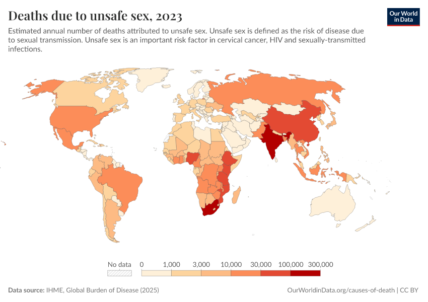 IHME, Global Burden of Disease (2024) – with minor processing by Our World in Data. “Deaths due to unsafe sex” [dataset]. IHME, Global Burden of Disease, “Global Burden of Disease - Risk Factors” [original data]. Retrieved January 6, 2026 from https://select-date-by-typing.owid.pages.dev/grapher/deaths-due-to-unsafe-sex
