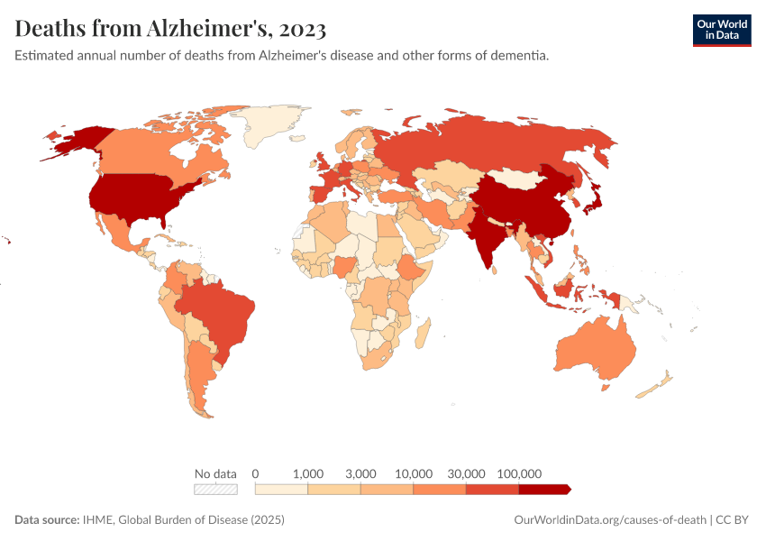 IHME, Global Burden of Disease (2024) – with minor processing by Our World in Data. “Deaths from Alzheimer's” [dataset]. IHME, Global Burden of Disease, “Global Burden of Disease - Deaths and DALYs” [original data]. Retrieved January 6, 2026 from https://select-date-by-typing.owid.pages.dev/grapher/deaths-from-alzheimers