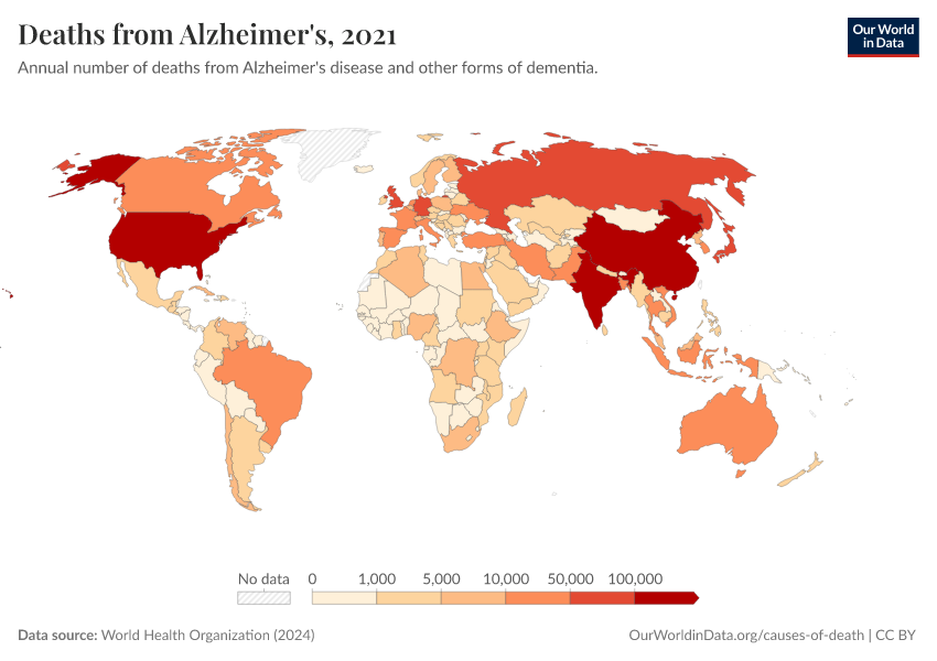 “Data Page: Deaths from Alzheimer's”, part of the following publication: Esteban Ortiz-Ospina and Max Roser (2016) - “Global Health”. Data adapted from World Health Organization. Retrieved from https://select-date-by-typing.owid.pages.dev/grapher/deaths-from-alzheimers-other-dementias [online resource]How to cite this data