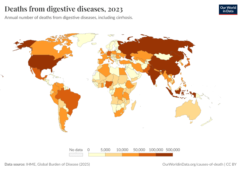 IHME, Global Burden of Disease (2024) – with minor processing by Our World in Data. “Deaths from digestive diseases” [dataset]. IHME, Global Burden of Disease, “Global Burden of Disease - Deaths and DALYs” [original data]. Retrieved January 6, 2026 from https://select-date-by-typing.owid.pages.dev/grapher/deaths-from-digestive-diseases