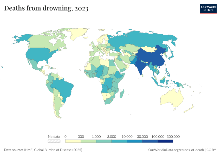 IHME, Global Burden of Disease (2024) – with minor processing by Our World in Data. “Deaths from drowning” [dataset]. IHME, Global Burden of Disease, “Global Burden of Disease - Deaths and DALYs” [original data]. Retrieved January 6, 2026 from https://select-date-by-typing.owid.pages.dev/grapher/deaths-from-drowning