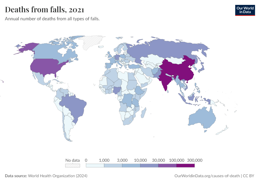 World Health Organization (2024) – with major processing by Our World in Data. “Deaths from falls” [dataset]. World Health Organization, “Global Health Estimates” [original data]. Retrieved January 6, 2026 from https://select-date-by-typing.owid.pages.dev/grapher/deaths-from-falls