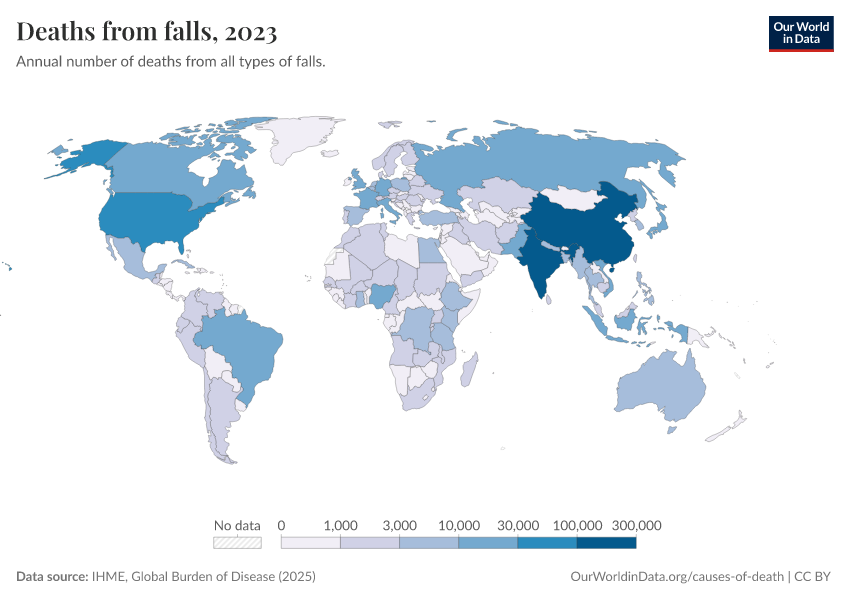 IHME, Global Burden of Disease (2024) – with minor processing by Our World in Data. “Deaths from falls” [dataset]. IHME, Global Burden of Disease, “Global Burden of Disease - Deaths and DALYs” [original data]. Retrieved January 6, 2026 from https://select-date-by-typing.owid.pages.dev/grapher/deaths-from-falls-gbd