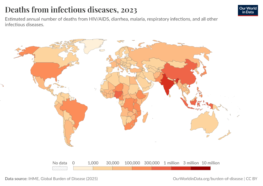 IHME, Global Burden of Disease (2024) – with minor processing by Our World in Data. “Deaths from infectious diseases” [dataset]. IHME, Global Burden of Disease, “Global Burden of Disease - Deaths and DALYs” [original data]. Retrieved January 6, 2026 from https://select-date-by-typing.owid.pages.dev/grapher/deaths-from-infectious-diseases
