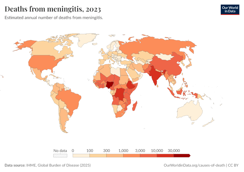 IHME, Global Burden of Disease (2024) – with minor processing by Our World in Data. “Deaths from meningitis” [dataset]. IHME, Global Burden of Disease, “Global Burden of Disease - Deaths and DALYs” [original data]. Retrieved January 6, 2026 from https://select-date-by-typing.owid.pages.dev/grapher/deaths-from-meningitis