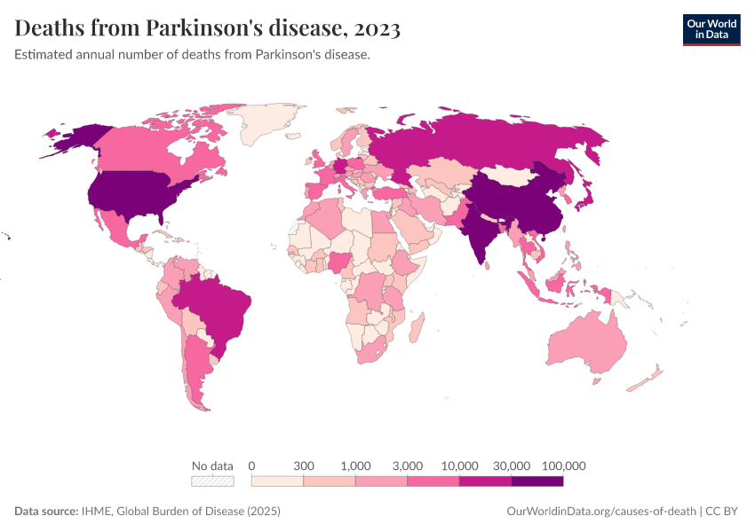 IHME, Global Burden of Disease (2024) – with minor processing by Our World in Data. “Deaths from Parkinson's disease” [dataset]. IHME, Global Burden of Disease, “Global Burden of Disease - Deaths and DALYs” [original data]. Retrieved January 6, 2026 from https://select-date-by-typing.owid.pages.dev/grapher/deaths-from-parkinsons-disease