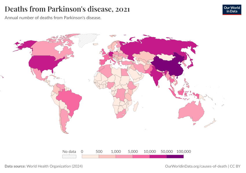 World Health Organization (2024) – with major processing by Our World in Data. “Deaths from Parkinson's disease” [dataset]. World Health Organization, “Global Health Estimates” [original data]. Retrieved January 6, 2026 from https://select-date-by-typing.owid.pages.dev/grapher/deaths-from-parkinsons-disease-ghe