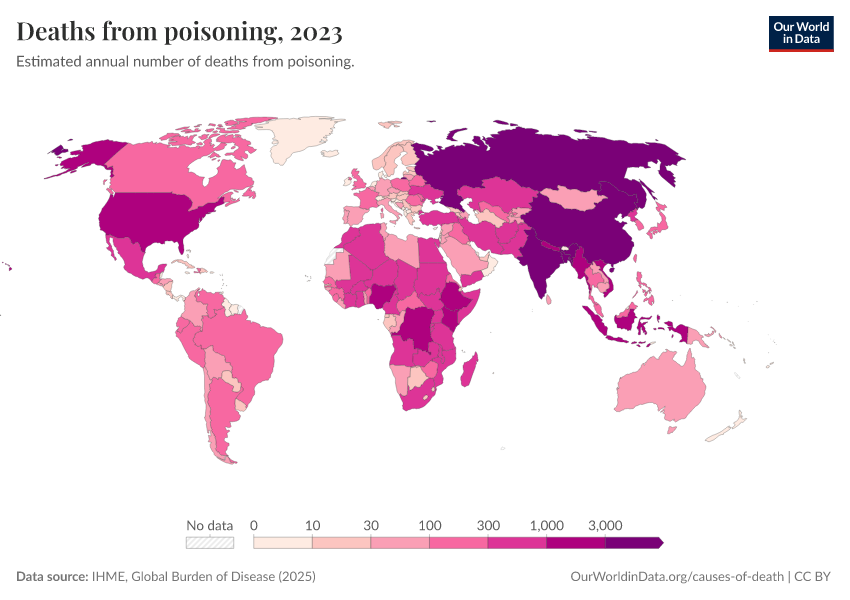 IHME, Global Burden of Disease (2024) – with minor processing by Our World in Data. “Deaths from poisoning” [dataset]. IHME, Global Burden of Disease, “Global Burden of Disease - Deaths and DALYs” [original data]. Retrieved January 6, 2026 from https://select-date-by-typing.owid.pages.dev/grapher/deaths-from-poisoning