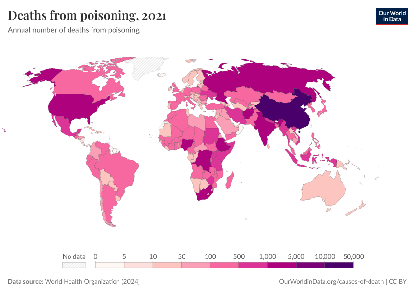 World Health Organization (2024) – with major processing by Our World in Data. “Deaths from poisoning” [dataset]. World Health Organization, “Global Health Estimates” [original data]. Retrieved January 6, 2026 from https://select-date-by-typing.owid.pages.dev/grapher/deaths-from-poisonings-ghe