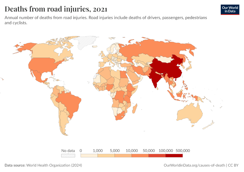 World Health Organization (2024) – with major processing by Our World in Data. “Deaths from road injuries” [dataset]. World Health Organization, “Global Health Estimates” [original data]. Retrieved January 6, 2026 from https://select-date-by-typing.owid.pages.dev/grapher/deaths-from-road-injuries