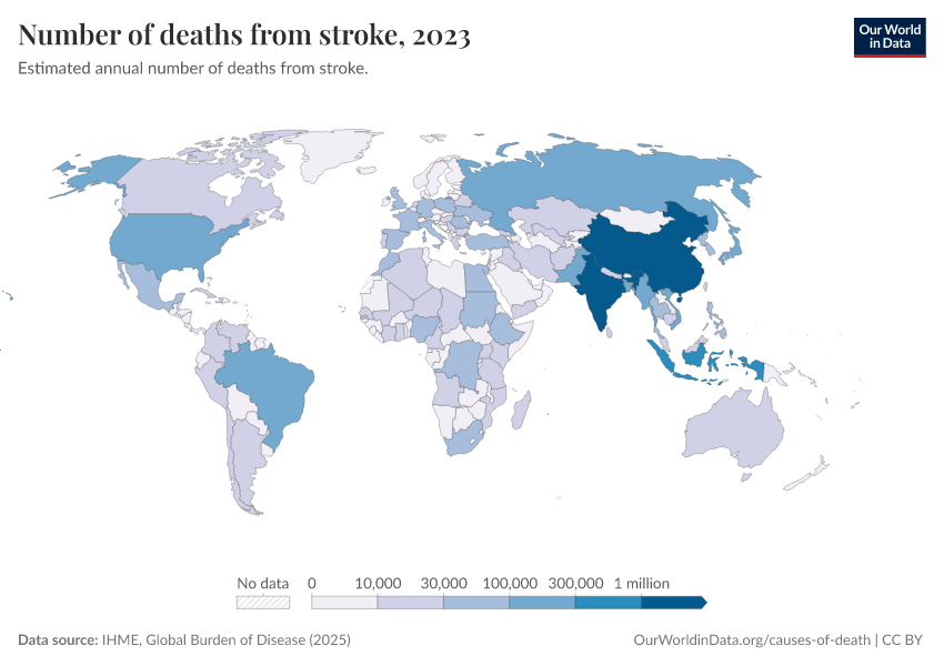IHME, Global Burden of Disease (2024) – with minor processing by Our World in Data. “Number of deaths from stroke” [dataset]. IHME, Global Burden of Disease, “Global Burden of Disease - Deaths and DALYs” [original data]. Retrieved January 6, 2026 from https://select-date-by-typing.owid.pages.dev/grapher/deaths-from-strokes