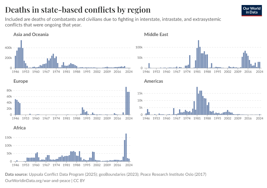 Uppsala Conflict Data Program (2025); geoBoundaries (2023); Peace Research Institute Oslo (2017) – processed by Our World in Data. “Deaths in state-based conflicts by region” [dataset]. Uppsala Conflict Data Program, “Georeferenced Event Dataset v25.1”; geoBoundaries, “geoBoundaries - Comprehensive Global Administrative Zones (CGAZ) 6.0.0”; Peace Research Institute Oslo, “Battle deaths v3.1” [original data]. Retrieved January 6, 2026 from https://select-date-by-typing.owid.pages.dev/grapher/deaths-in-state-based-conflicts-by-region