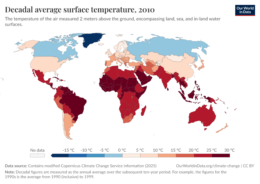 “Data Page: Decadal average surface temperature”, part of the following publication: Hannah Ritchie, Pablo Rosado, and Veronika Samborska (2024) - “Climate Change”. Data adapted from Contains modified Copernicus Climate Change Service information. Retrieved from https://select-date-by-typing.owid.pages.dev/grapher/decadal-average-surface-temperature [online resource]How to cite this data