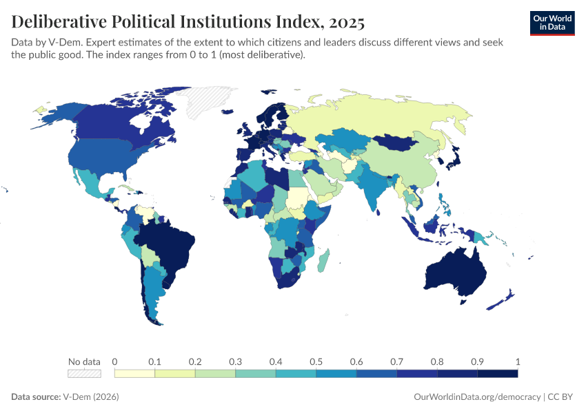 V-Dem (2025) – processed by Our World in Data. “Deliberative political institutions index – V-Dem” [dataset]. V-Dem, “Democracy report v15” [original data]. Retrieved January 6, 2026 from https://select-date-by-typing.owid.pages.dev/grapher/deliberative-political-institutions-index