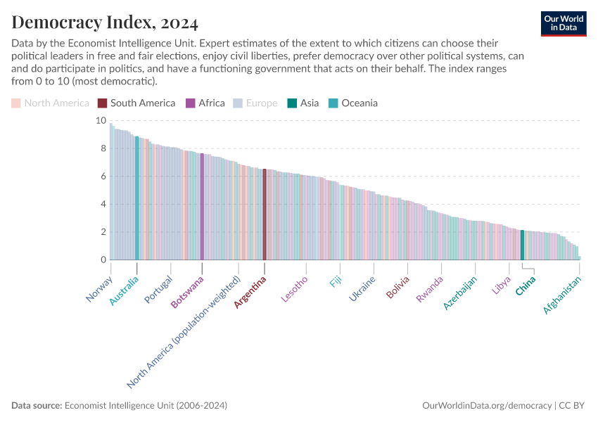Economist Intelligence Unit (2006-2024) – processed by Our World in Data. “Democracy index – Economist Intelligence Unit” [dataset]. Economist Intelligence Unit, “Democracy Index 2021: The China challenge”; Economist Intelligence Unit, “Democracy Index 2022: Frontline democracy and the battle for Ukraine”; Economist Intelligence Unit, “Democracy Index 2023: Age of Conflict”; Economist Intelligence Unit, “Democracy Index 2024: What's wrong with representative democracy?”; Gapminder, “Democracy Index v4”; Various sources, “Population” [original data]. Retrieved January 6, 2026 from https://select-date-by-typing.owid.pages.dev/grapher/democracy-index-eiu