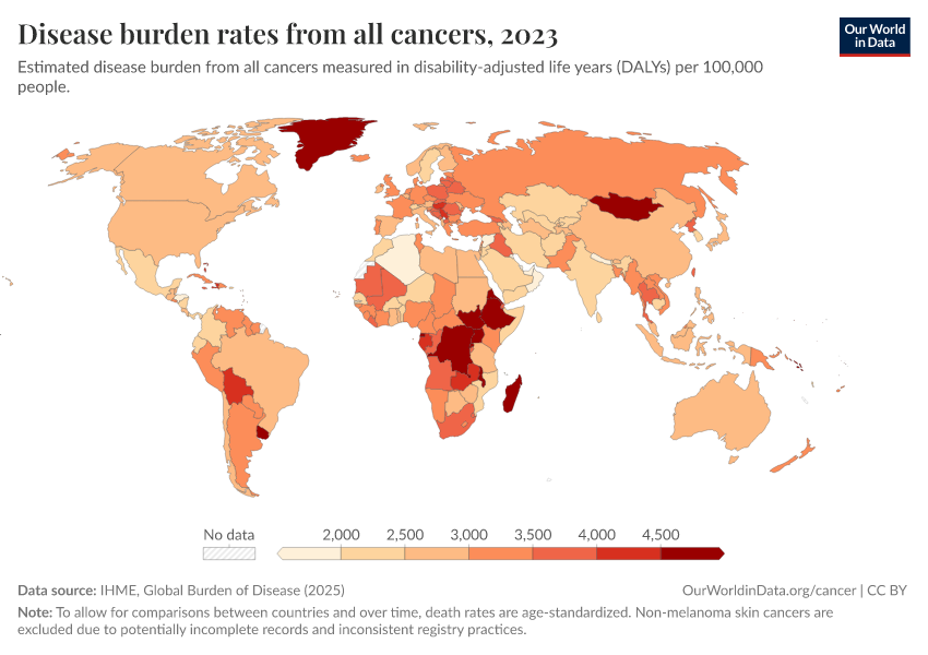 IHME, Global Burden of Disease (2024) – with minor processing by Our World in Data. “Disease burden rates from all cancers” [dataset]. IHME, Global Burden of Disease, “Global Burden of Disease - Deaths and DALYs” [original data]. Retrieved January 6, 2026 from https://select-date-by-typing.owid.pages.dev/grapher/disease-burden-rates-from-cancers