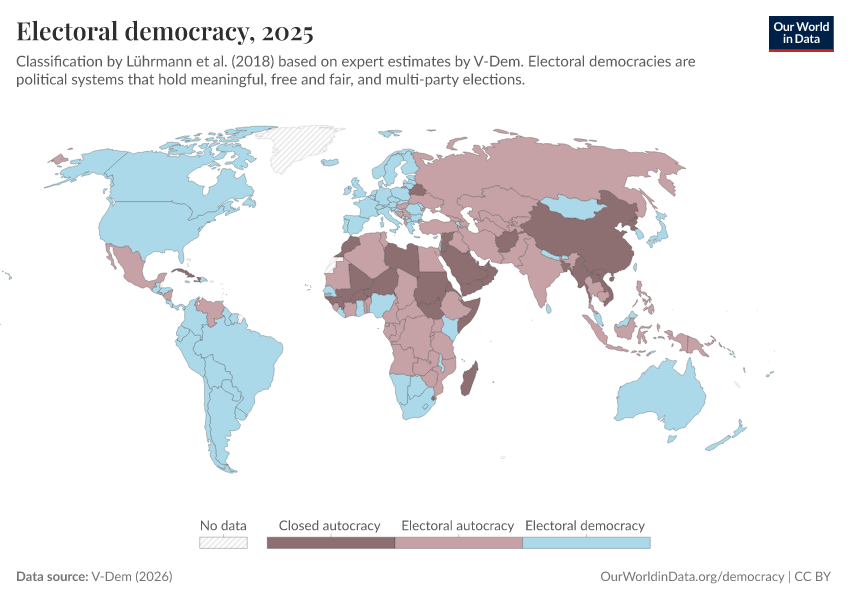 V-Dem (2025) – processed by Our World in Data. “Political regime – reduced” [dataset]. V-Dem, “Democracy report v15” [original data]. Retrieved January 6, 2026 from https://select-date-by-typing.owid.pages.dev/grapher/electoral-democracy-row