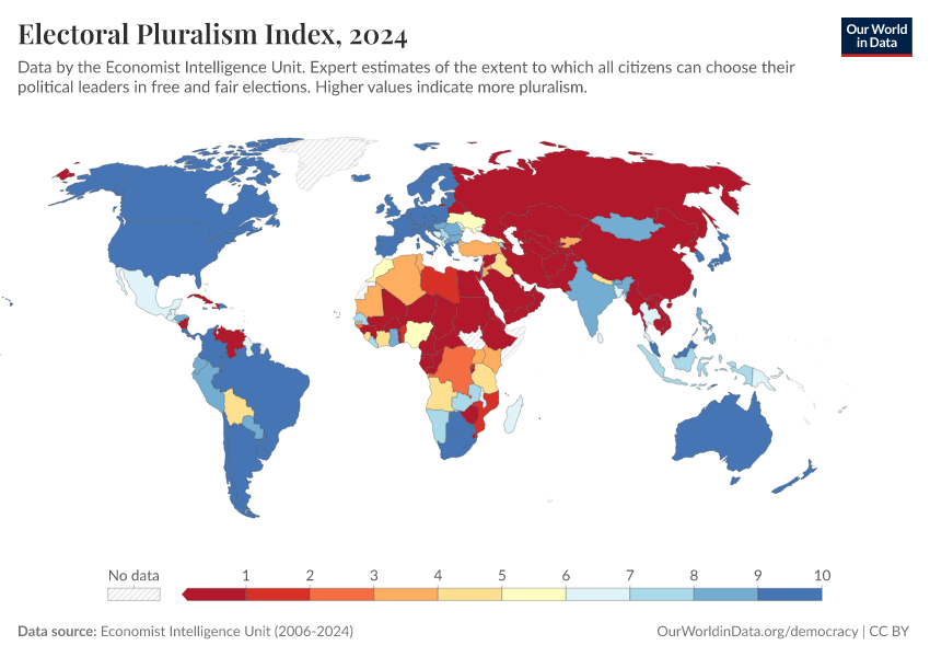 Economist Intelligence Unit (2006-2024) – processed by Our World in Data. “Electoral Pluralism Index” [dataset]. Economist Intelligence Unit, “Democracy Index 2021: The China challenge”; Economist Intelligence Unit, “Democracy Index 2022: Frontline democracy and the battle for Ukraine”; Economist Intelligence Unit, “Democracy Index 2023: Age of Conflict”; Economist Intelligence Unit, “Democracy Index 2024: What's wrong with representative democracy?”; Gapminder, “Democracy Index v4”; Various sources, “Population” [original data]. Retrieved January 6, 2026 from https://select-date-by-typing.owid.pages.dev/grapher/electoral-pluralism-index-eiu