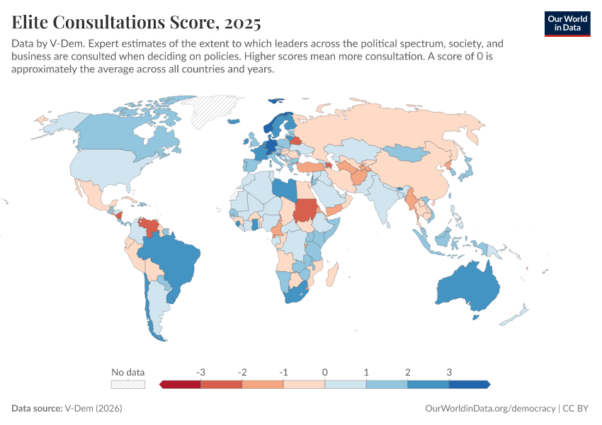 “Data Page: Elite consultation”, part of the following publication: Bastian Herre, Lucas Rodés-Guirao, and Esteban Ortiz-Ospina (2013) - “Democracy”. Data adapted from V-Dem. Retrieved from https://select-date-by-typing.owid.pages.dev/grapher/elite-consultations-score [online resource]How to cite this data