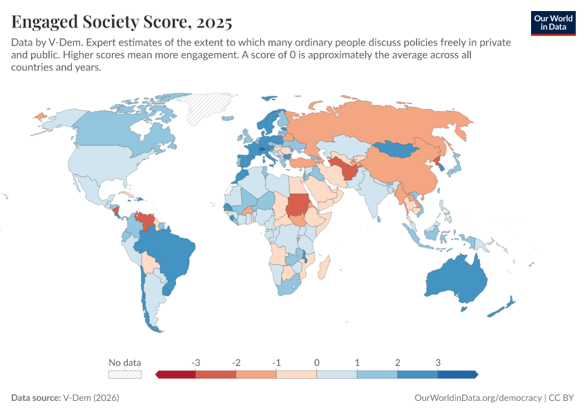 “Data Page: Engaged society”, part of the following publication: Bastian Herre, Lucas Rodés-Guirao, and Esteban Ortiz-Ospina (2013) - “Democracy”. Data adapted from V-Dem. Retrieved from https://select-date-by-typing.owid.pages.dev/grapher/engaged-society-score [online resource]How to cite this data