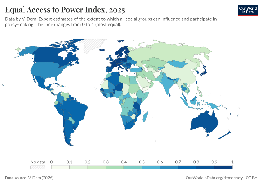 “Data Page: Equal access to power index”, part of the following publication: Bastian Herre, Lucas Rodés-Guirao, and Esteban Ortiz-Ospina (2013) - “Democracy”. Data adapted from V-Dem. Retrieved from https://select-date-by-typing.owid.pages.dev/grapher/equal-access-to-power-index [online resource]How to cite this data