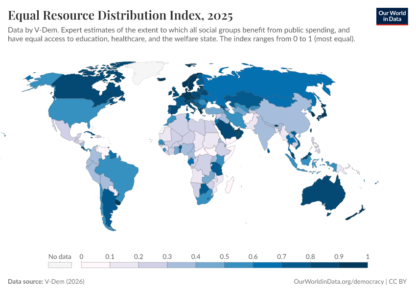 V-Dem (2025) – processed by Our World in Data. “Equal resource distribution index – V-Dem” [dataset]. V-Dem, “Democracy report v15” [original data]. Retrieved January 6, 2026 from https://select-date-by-typing.owid.pages.dev/grapher/equal-resource-distribution-index