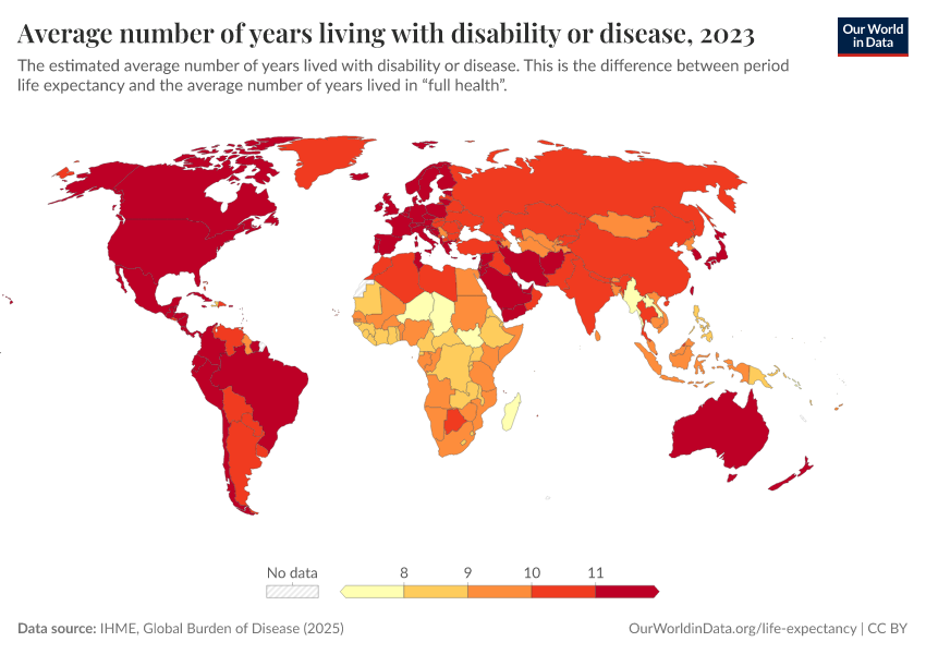 “Data Page: Average number of years living with disability or disease”, part of the following publication: Saloni Dattani, Lucas Rodés-Guirao, Hannah Ritchie, Esteban Ortiz-Ospina, and Max Roser (2023) - “Life Expectancy”. Data adapted from IHME, Global Burden of Disease. Retrieved from https://select-date-by-typing.owid.pages.dev/grapher/expected-years-of-living-with-disability-or-disease-burden [online resource]How to cite this data