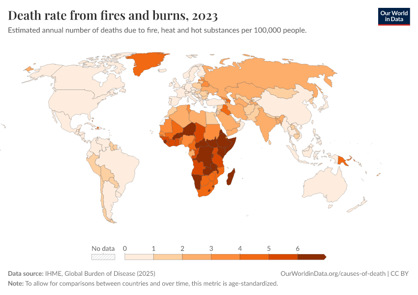 IHME, Global Burden of Disease (2024) – with minor processing by Our World in Data. “Death rate from fires and burns” [dataset]. IHME, Global Burden of Disease, “Global Burden of Disease - Deaths and DALYs” [original data]. Retrieved January 6, 2026 from https://select-date-by-typing.owid.pages.dev/grapher/fire-death-rates