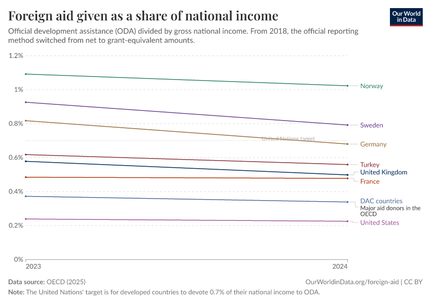 OECD (2025) – with minor processing by Our World in Data. “Foreign aid given as a share of national income – Official estimate” [dataset]. OECD, “OECD Official Development Assistance (ODA) - DAC1: Flows by provider (ODA+OOF+Private)” [original data]. Retrieved January 6, 2026 from https://select-date-by-typing.owid.pages.dev/grapher/foreign-aid-given-as-a-share-of-national-income