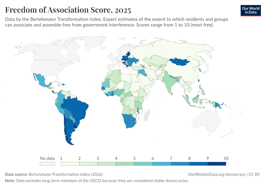 “Data Page: Freedom of association score”, part of the following publication: Bastian Herre, Lucas Rodés-Guirao, and Esteban Ortiz-Ospina (2013) - “Democracy”. Data adapted from Bertelsmann Transformation Index. Retrieved from https://select-date-by-typing.owid.pages.dev/grapher/freedom-of-association-score-bti [online resource]How to cite this data