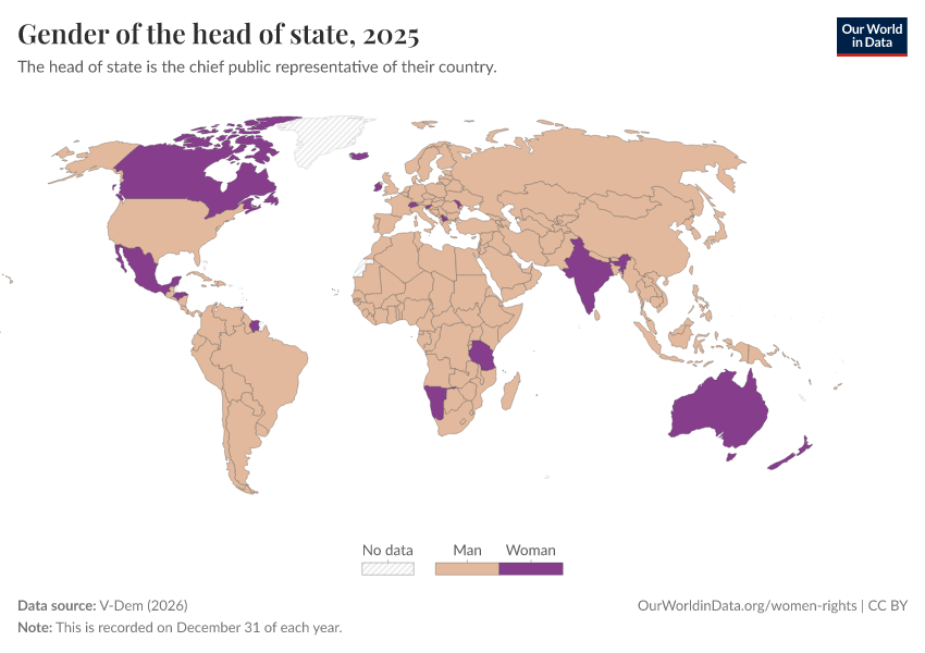 V-Dem (2025) – processed by Our World in Data. “Gender of the head of state” [dataset]. V-Dem, “Democracy report v15” [original data]. Retrieved January 6, 2026 from https://select-date-by-typing.owid.pages.dev/grapher/gender-of-the-head-of-state