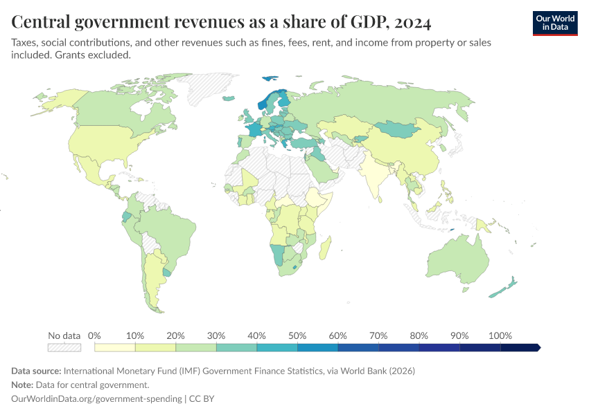 “Data Page: Central government revenues as a share of GDP”. Our World in Data (2026). Data adapted from International Monetary Fund (IMF) Government Finance Statistics, via World Bank. Retrieved from https://select-date-by-typing.owid.pages.dev/grapher/government-revenues-as-a-share-of-gdp-world-bank [online resource]How to cite this data