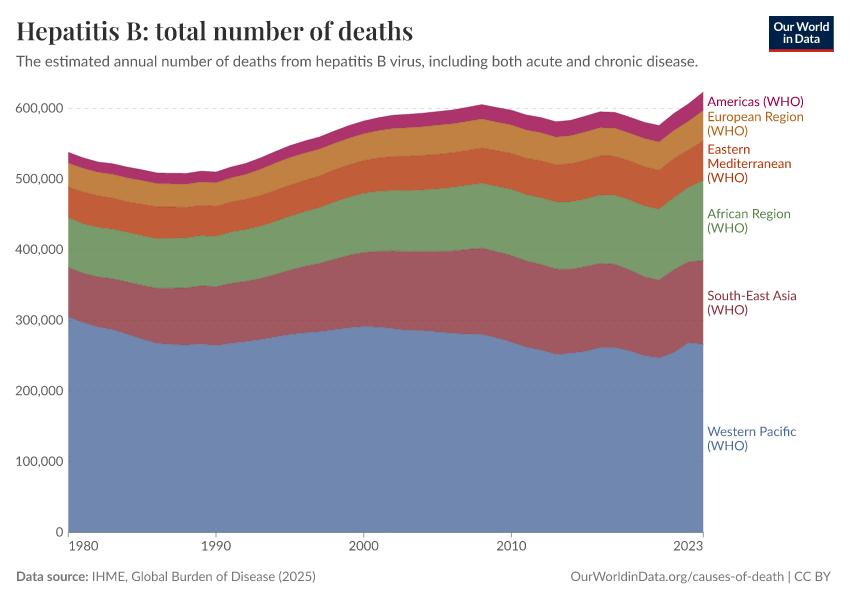 IHME, Global Burden of Disease (2024) – with minor processing by Our World in Data. “Hepatitis B: total number of deaths” [dataset]. IHME, Global Burden of Disease, “Global Burden of Disease - Deaths and DALYs” [original data]. Retrieved January 6, 2026 from https://select-date-by-typing.owid.pages.dev/grapher/hepatitis-b-number-of-deaths