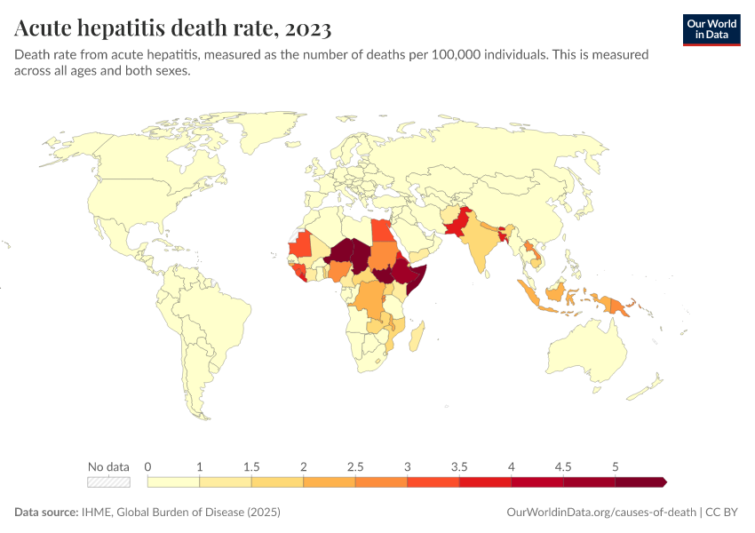 IHME, Global Burden of Disease (2024) – with minor processing by Our World in Data. “Acute hepatitis death rate” [dataset]. IHME, Global Burden of Disease, “Global Burden of Disease - Deaths and DALYs” [original data]. Retrieved January 6, 2026 from https://select-date-by-typing.owid.pages.dev/grapher/hepatitis-death-rate