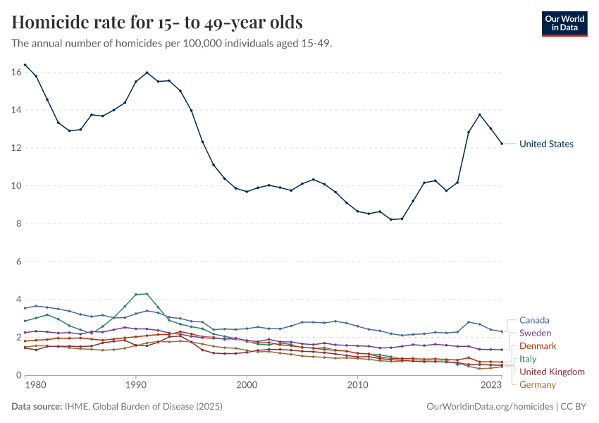 IHME, Global Burden of Disease (2024) – with minor processing by Our World in Data. “Homicide rate for 15- to 49-year olds” [dataset]. IHME, Global Burden of Disease, “Global Burden of Disease - Deaths and DALYs” [original data]. Retrieved January 6, 2026 from https://select-date-by-typing.owid.pages.dev/grapher/homicide-rate-in-15--to-49-year-olds