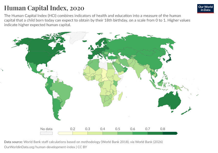 World Bank staff calculations based on methodology (World Bank 2018), via World Bank (2025) – processed by Our World in Data. “Human Capital Index” [dataset]. World Bank staff calculations based on methodology (World Bank 2018), via World Bank, “World Development Indicators 122” [original data]. Retrieved January 6, 2026 from https://select-date-by-typing.owid.pages.dev/grapher/human-capital-index-in-2018