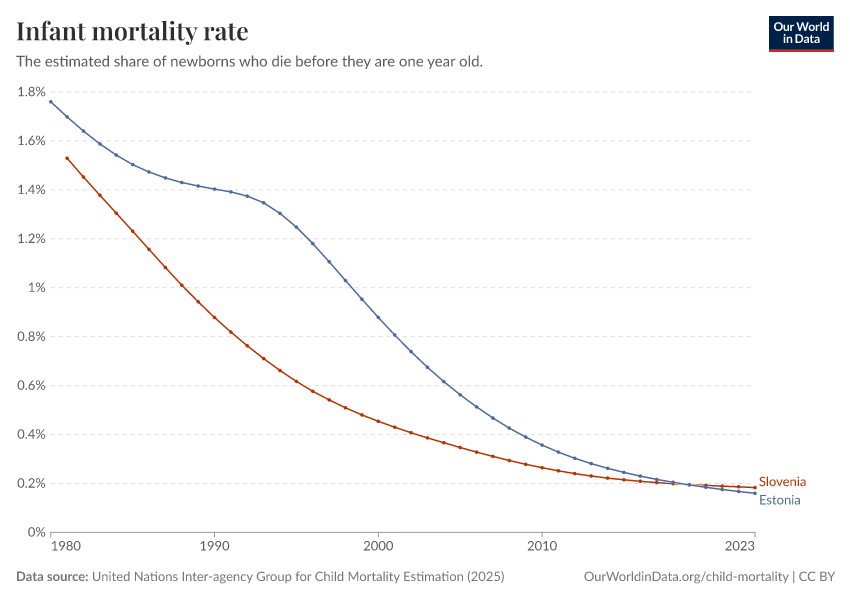 United Nations Inter-agency Group for Child Mortality Estimation (2025) – with major processing by Our World in Data. “Infant mortality rate” [dataset]. United Nations Inter-agency Group for Child Mortality Estimation, “United Nations Inter-agency Group for Child Mortality Estimation”; Various sources, “Population” [original data]. Retrieved January 6, 2026 from https://select-date-by-typing.owid.pages.dev/grapher/infant-mortality